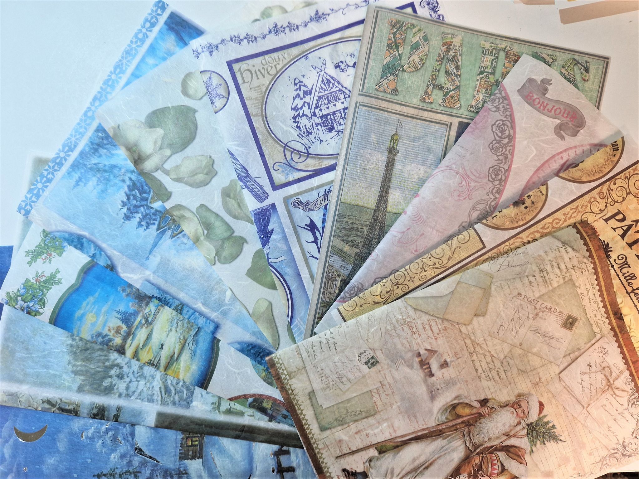 Create different effects by tearing, feathering or just using the sheet as a whole. Use on a materials great to decorate a candle or a glass plate. They will adhere to almost all surfaces.